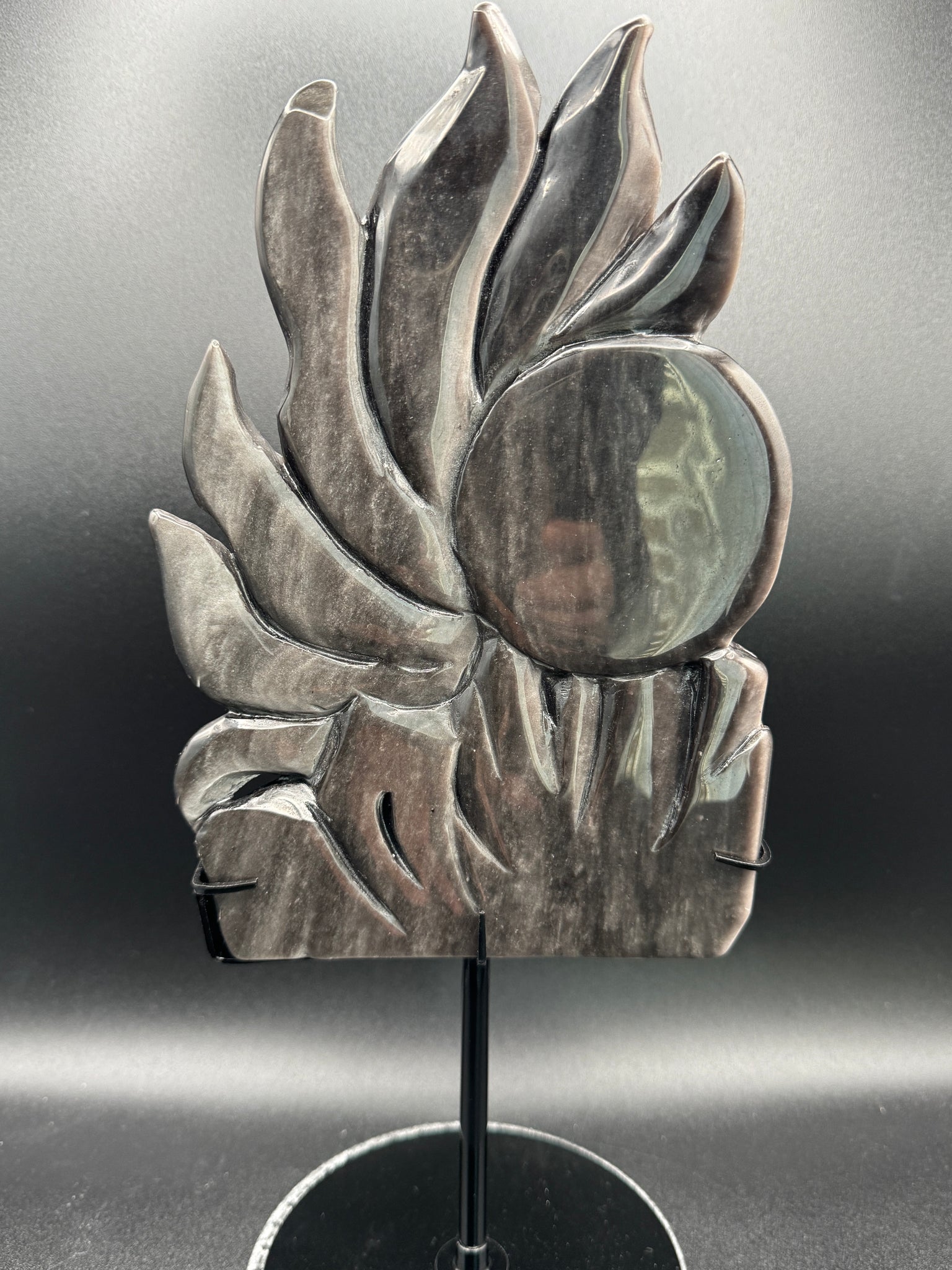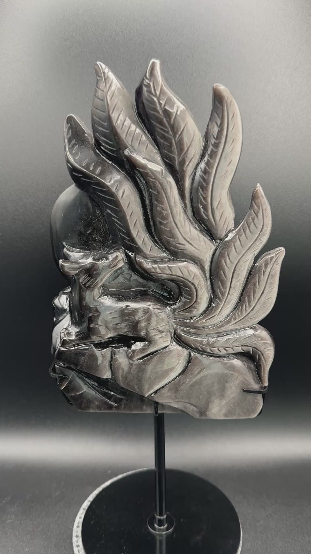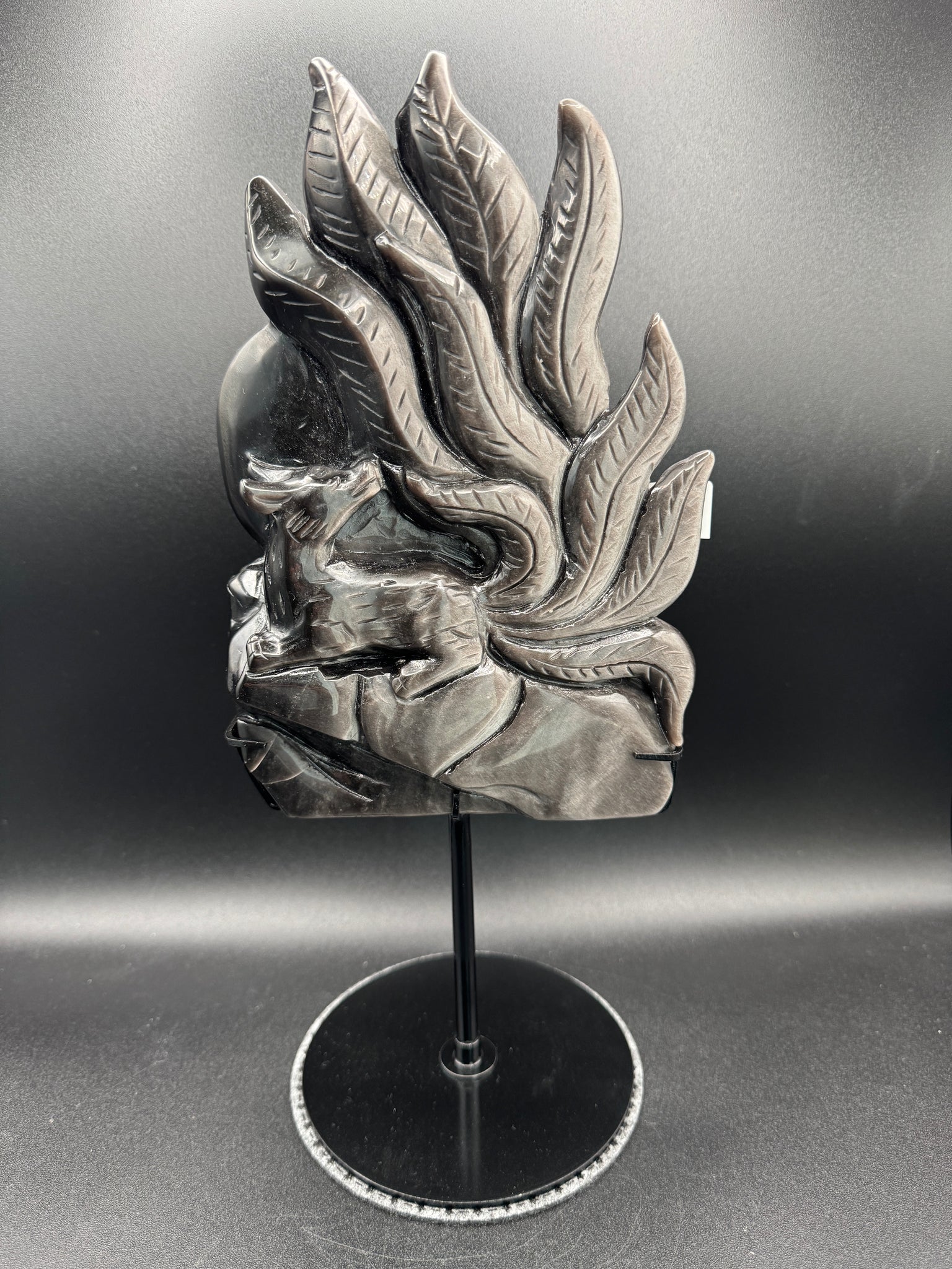 Step into the realm of mystique and transformation with this Epic Silver Sheen Obsidian Nine-Tail Fox, a powerful symbol of wisdom, protection, and spiritual mastery. Hand-carved with extraordinary detail, this captivating piece displays striking silver sheen ripples that shimmer across the fox’s flowing tails—an enchanting effect unique to high-quality obsidian. Displayed on its custom stand, it becomes a statement piece that radiates elegance and metaphysical strength.