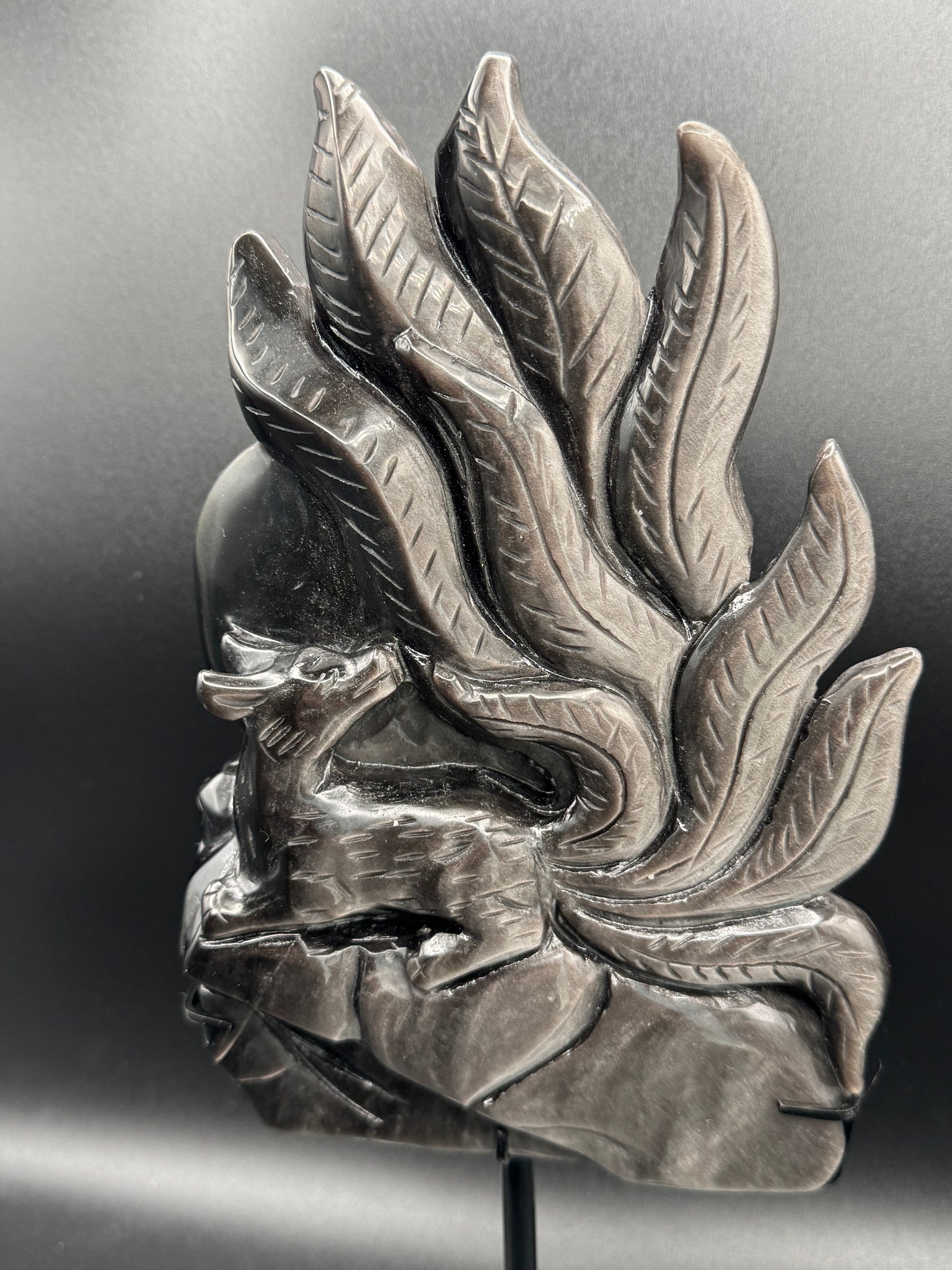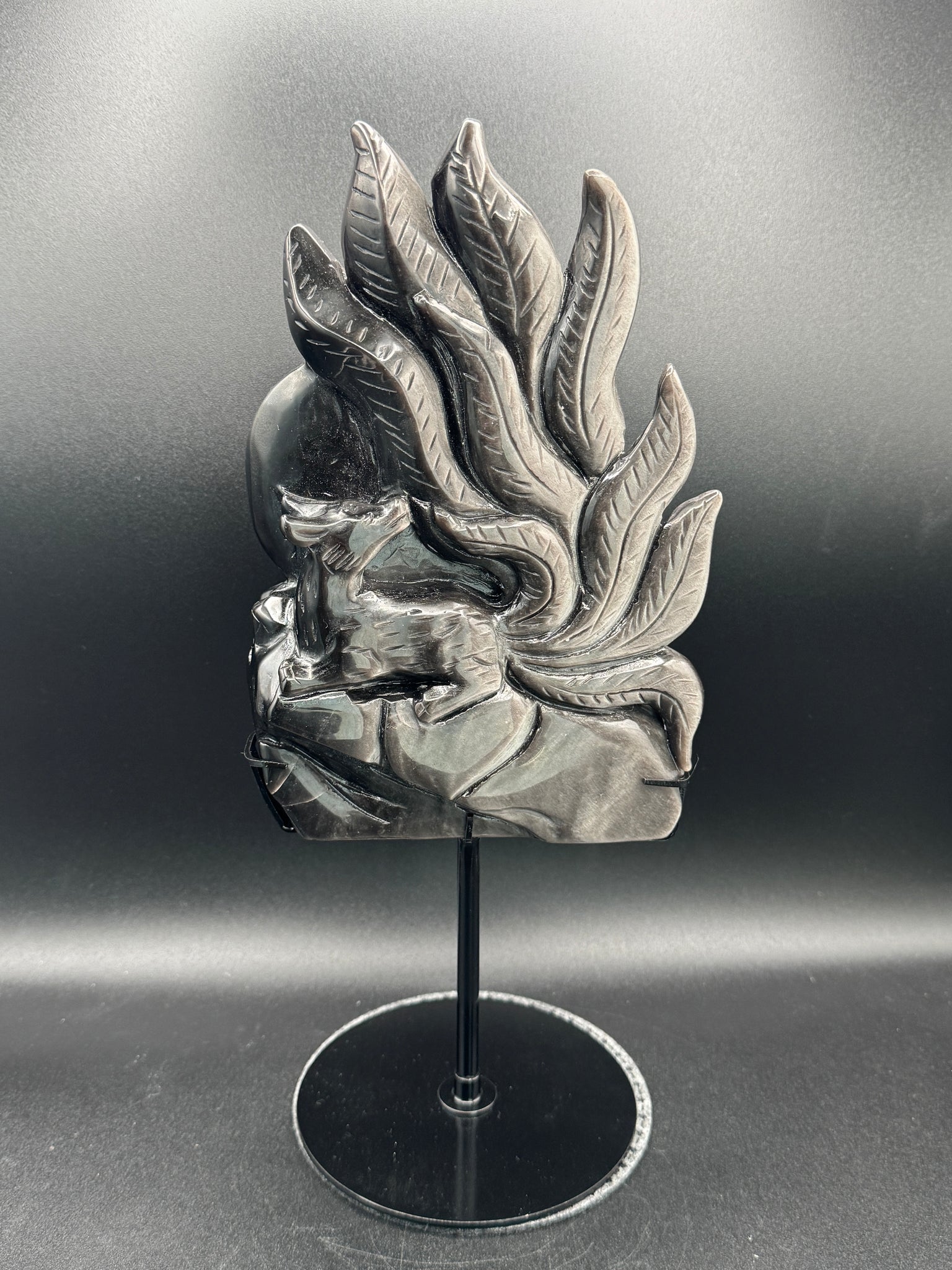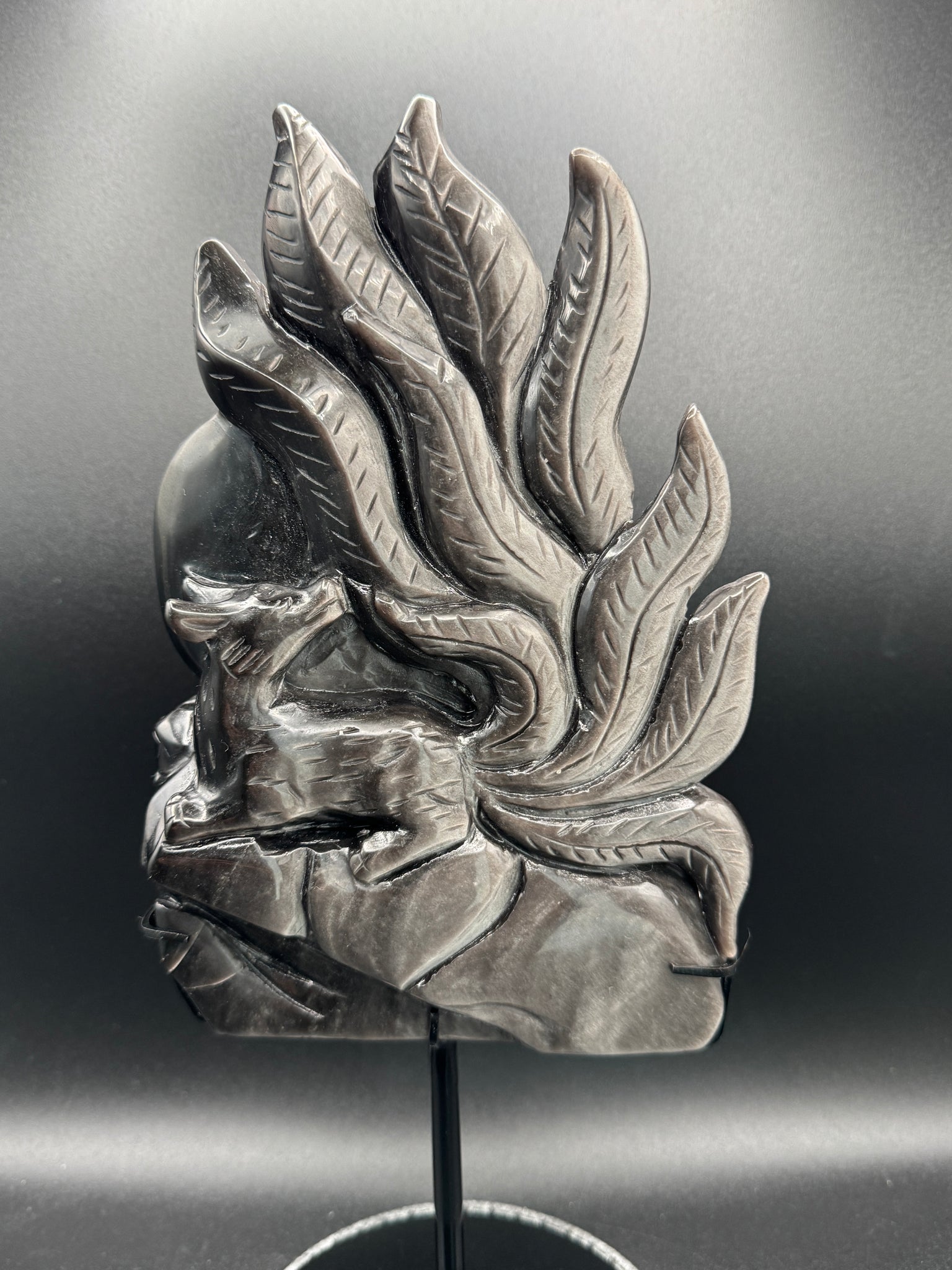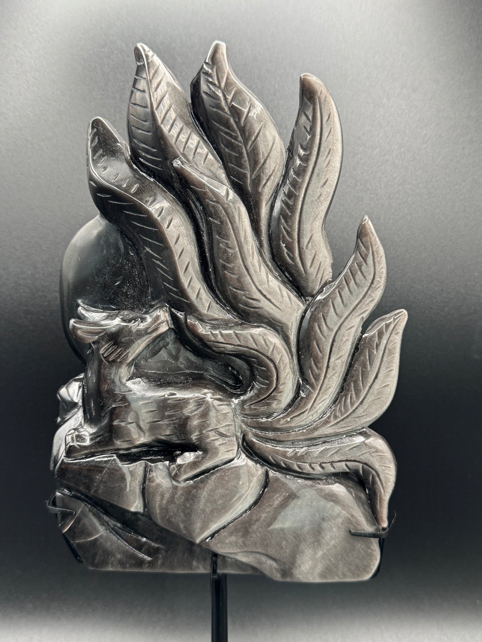 Epic Silver Sheen Obsidian Nine-Tail Fox Carving SZ47