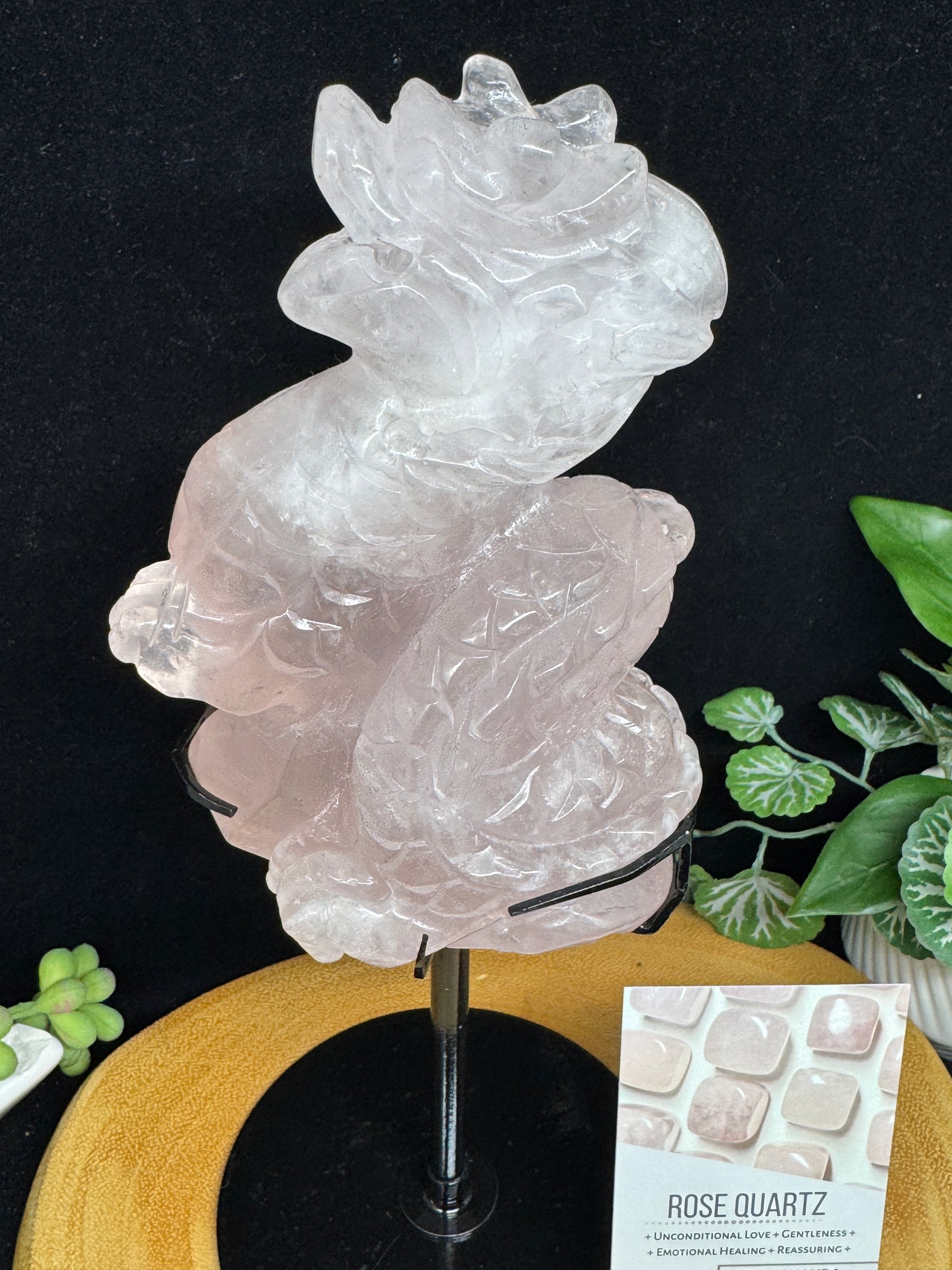 Rose quartz is known as the Stone of Unconditional Love, radiating compassion, emotional healing, and harmony. Paired with the dragon’s legendary presence, this piece becomes a powerful guardian for your home, altar, or sacred space.