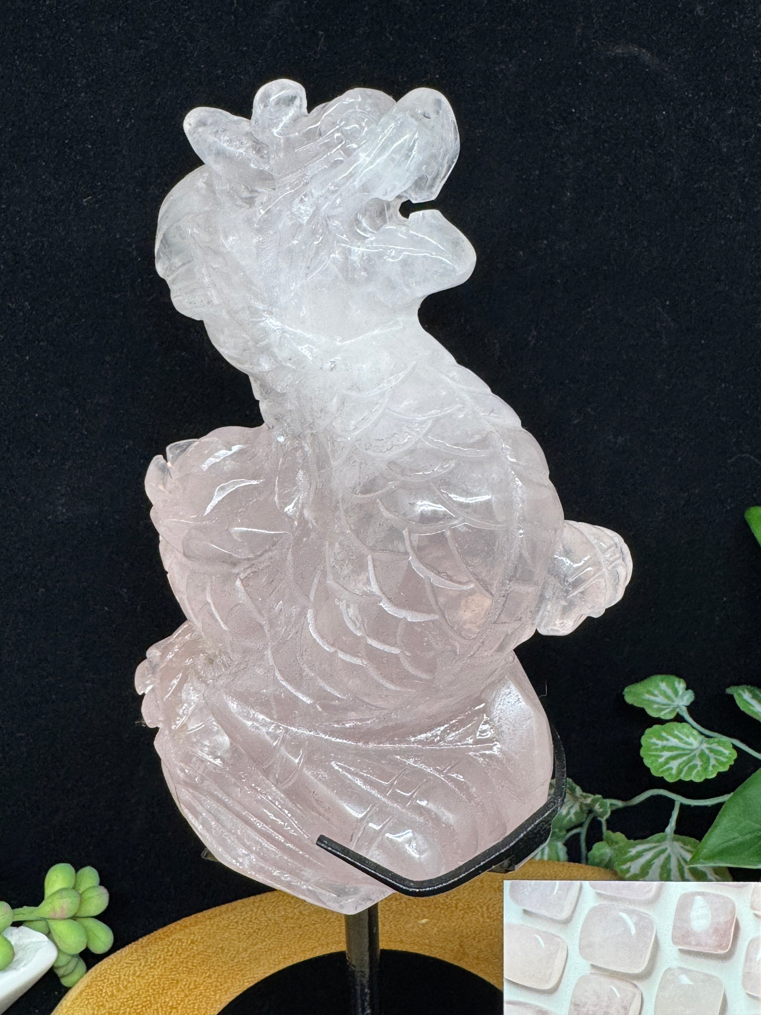 This unique carving measures 9 1/2" tall with its stand, with the dragon itself measuring approximately 6" and weighing 2 lb 1 oz. Its soft pink glow and intricate detailing make it a standout display piece and a meaningful gift for collectors or crystal lovers.