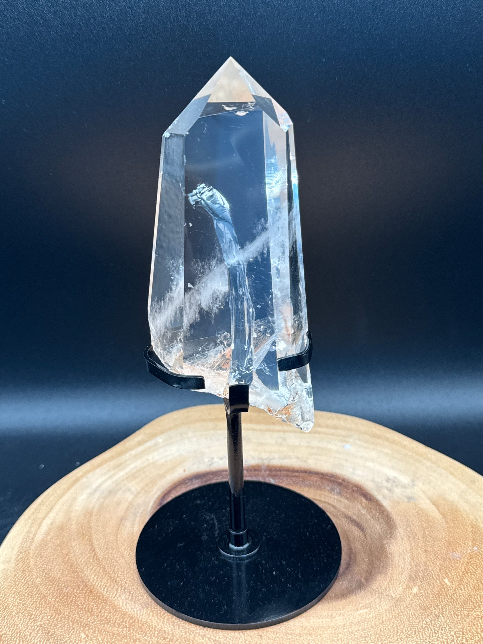 This stunning Clear Quartz point features natural internal rainbows that catch the light beautifully, creating flashes of color within its crystal-clear body. Expertly polished and paired with a custom display stand, this piece is perfect for showcasing on an altar, shelf, or desk.